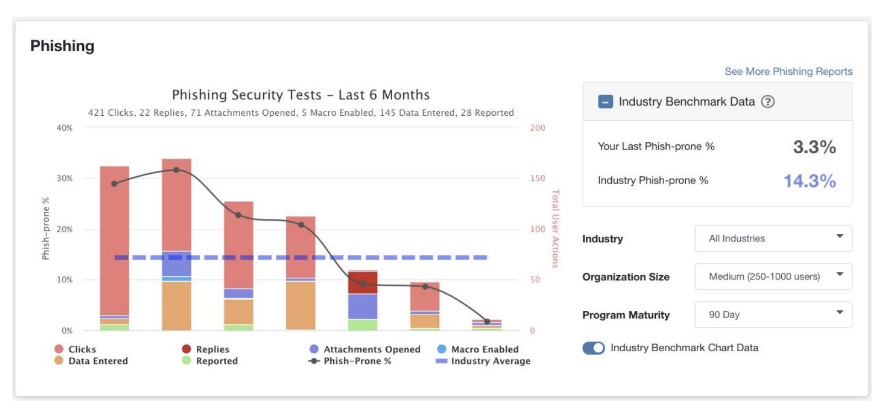Enterprise-strenght reporting, showing stats and graphs for both security awareness training and phishing, ready for management to illustrate great ROI.